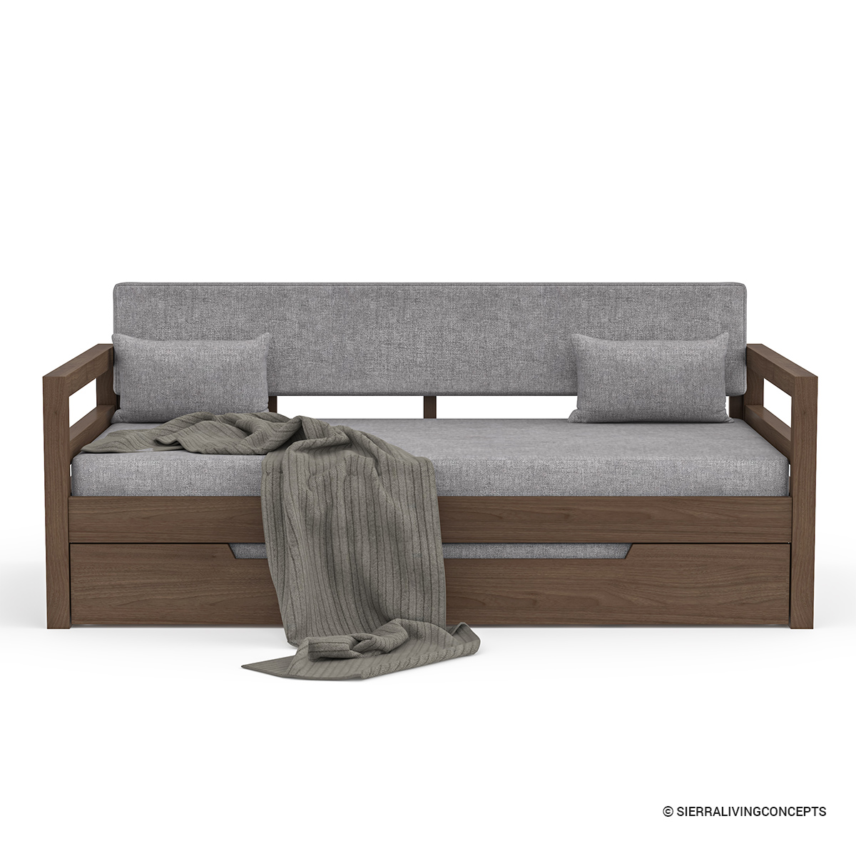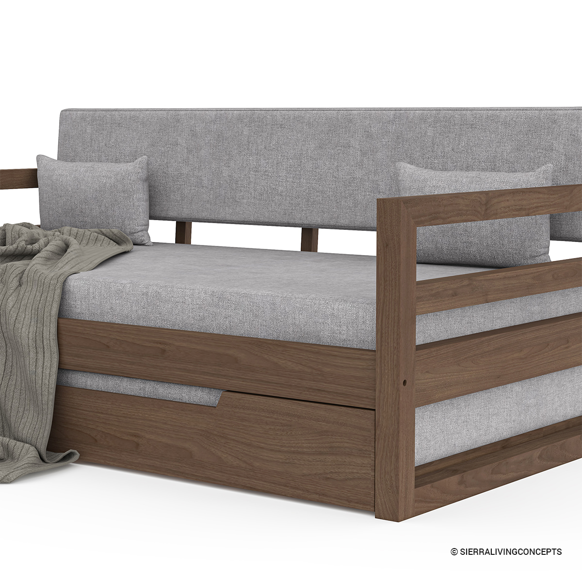 Relax, lounge, and host with ease on the Kenora Rustic Upholstered Daybed with Trundle. Its solid wood frame, soft padded upholstery, and rich walnut finish create a welcoming spot perfect for lounging, reading, or hosting friends and family.
