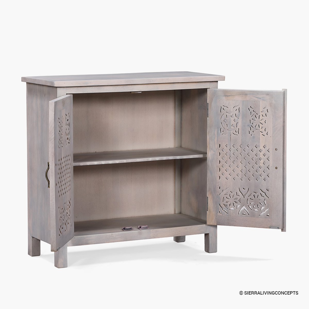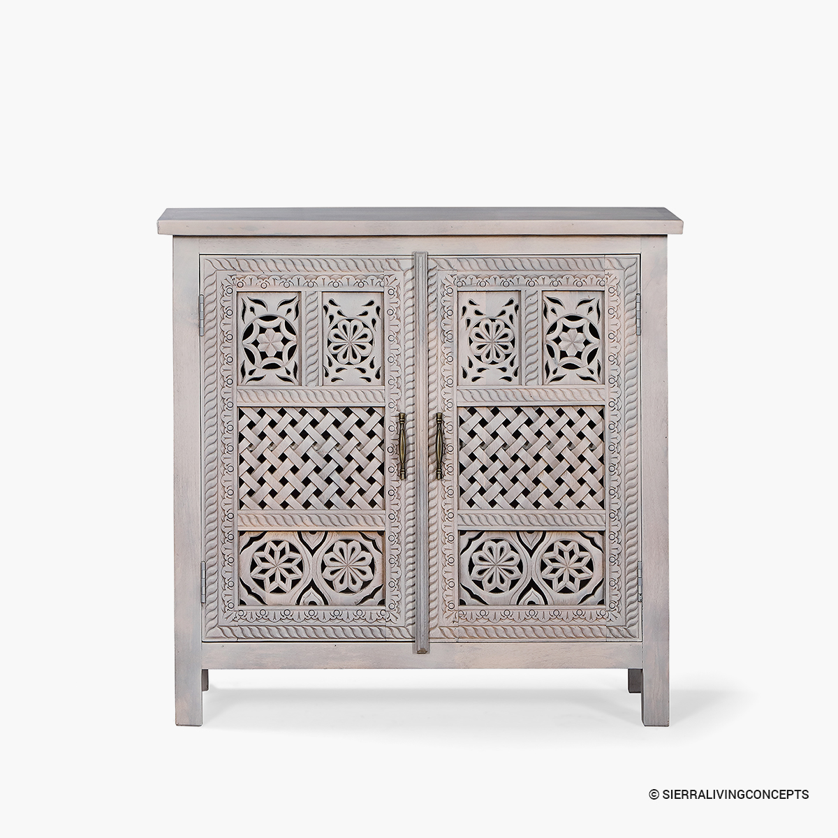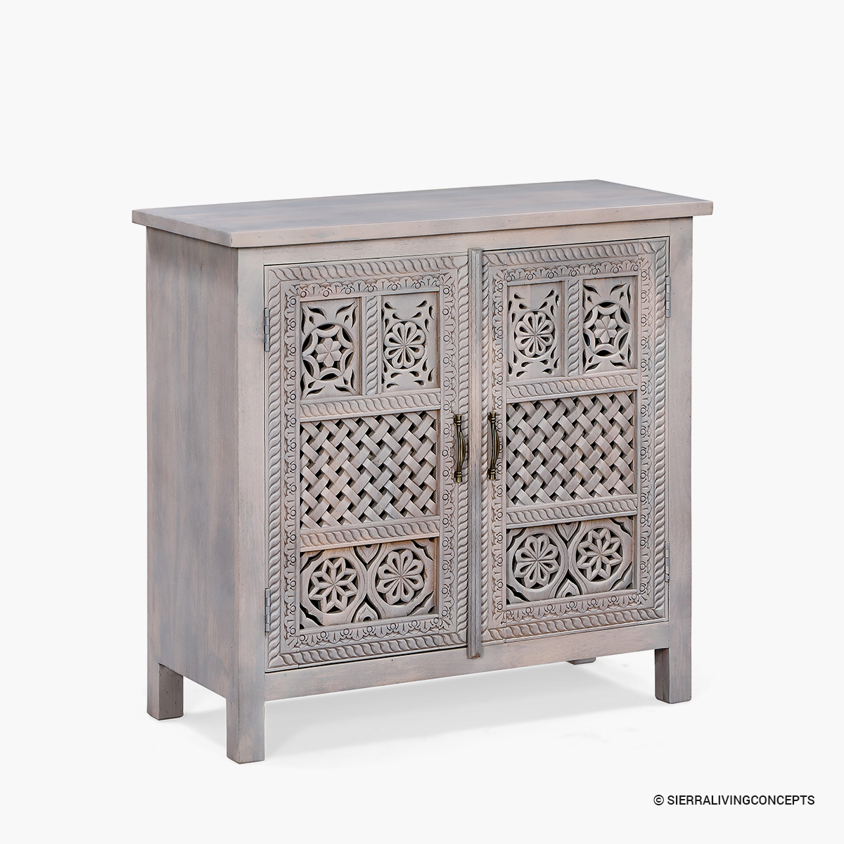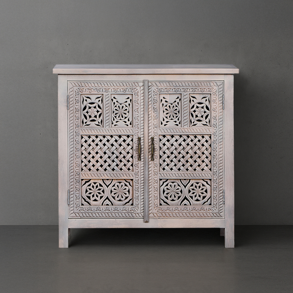 Uplift your living room decor with our Edson Hand Carved Whitewashed Accent Storage Cabinet recalls the sunlit courtyards of a grand palace, with every carved detail telling a story of heritage and craftsmanship, inspired by the elegance of Mughal-era design where intricate latticework and floral patterns were more than decoration, they were a form of art.