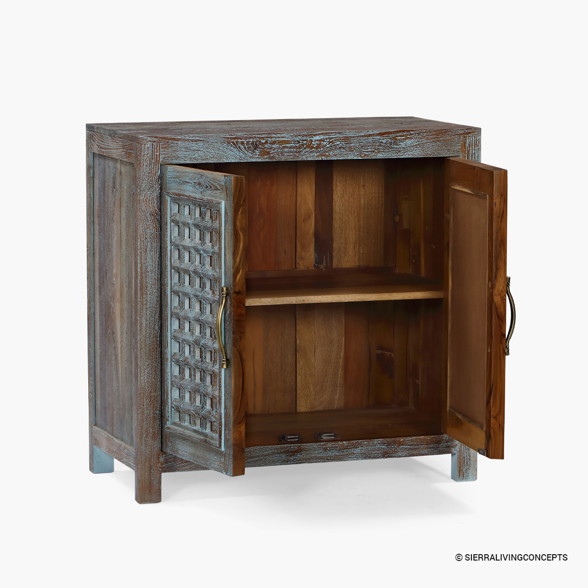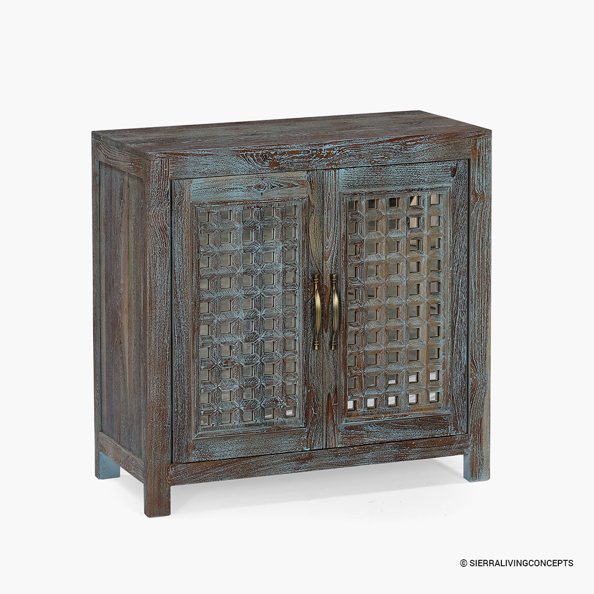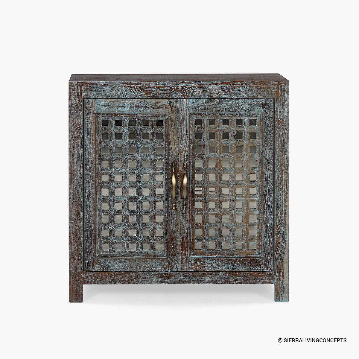 • The distressed finish mixes warm wood tones with hints of faded teal or blue-green, giving it a timeworn, authentic feel, while geometric lattice doors add striking texture and visual interest.
