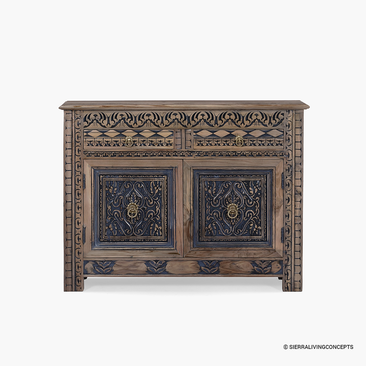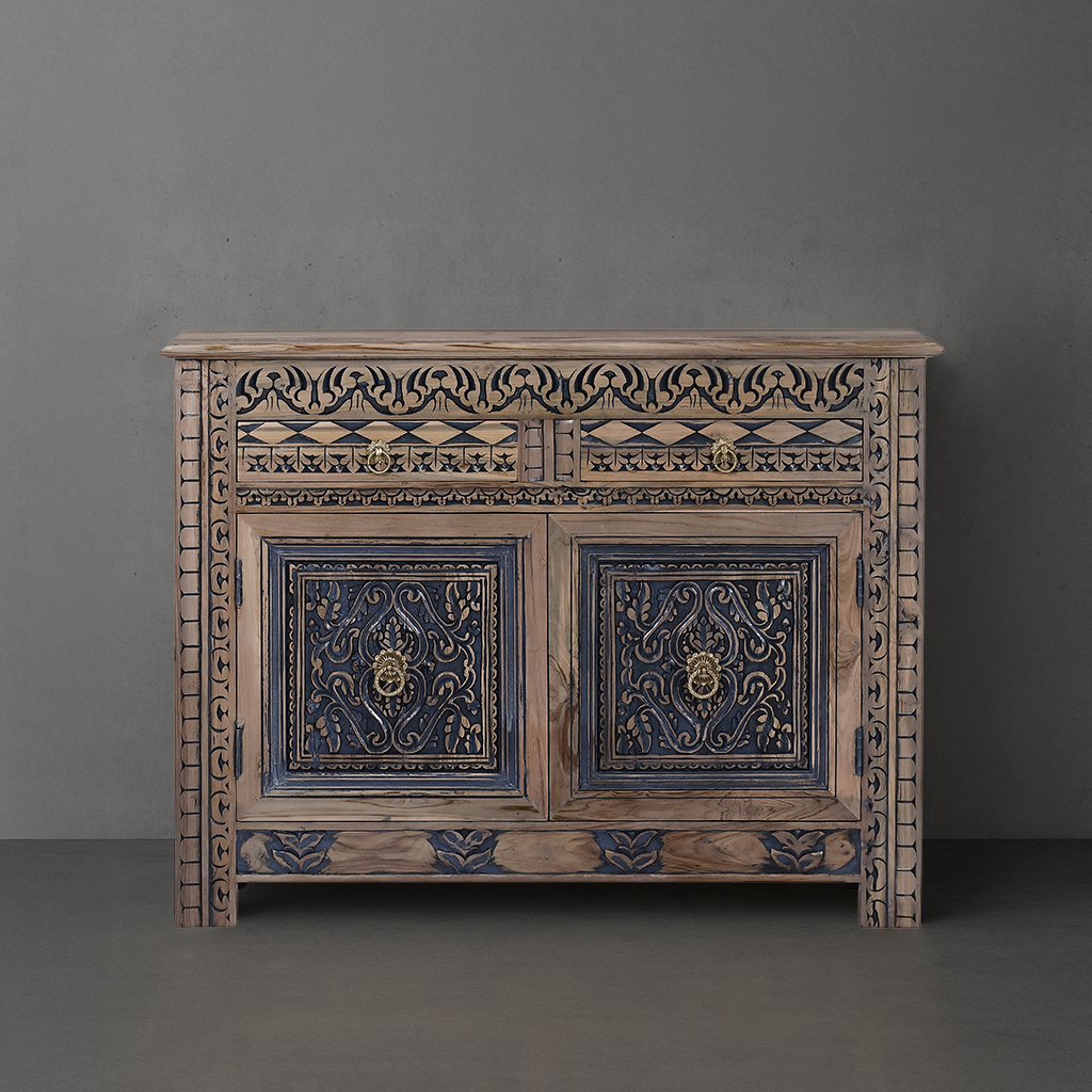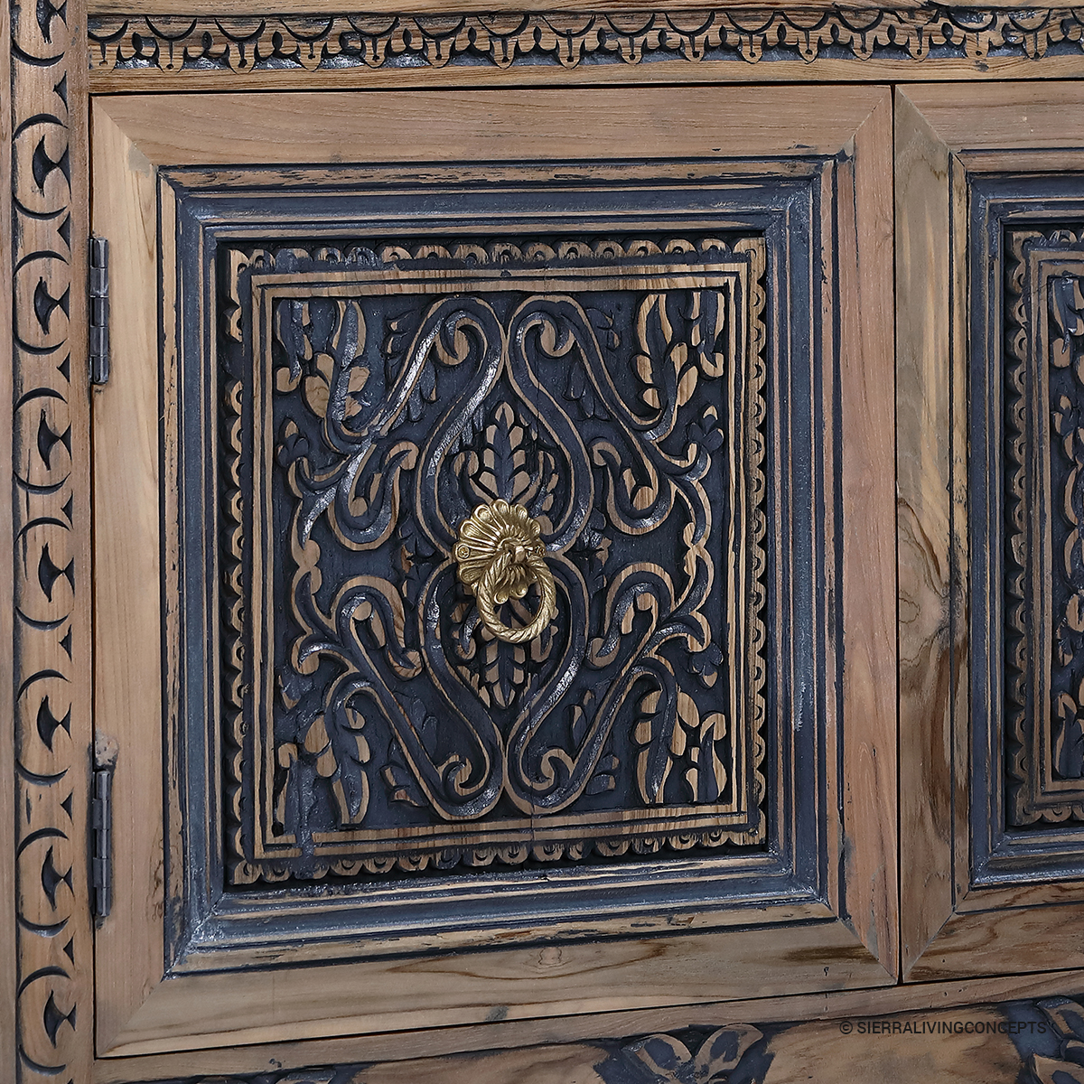 • Each cabinet is a singular masterpiece, meticulously hand-carved from solid wood by skilled artisans, ensuring that every intricate detail carries a unique, authentic character imbued with tradition.