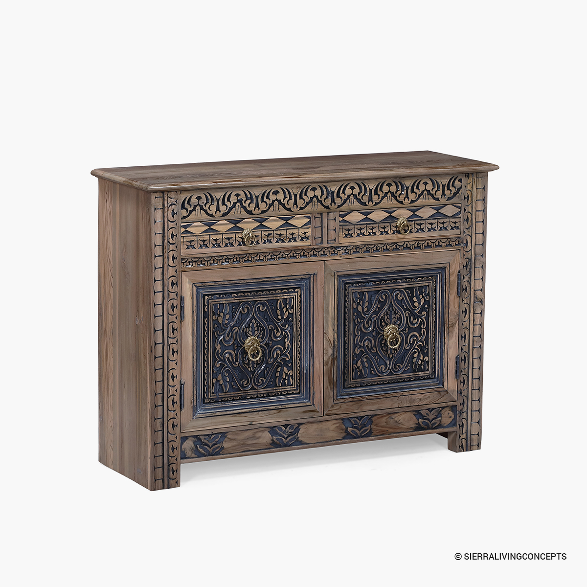 Journey to ancient artisan villages with this Amherst Ornate Hand Carved Accent Storage Cabinet with Drawers, a vibrant narrative carved in wood. Its intricate patterns and rich, distressed hues tell a story of cultural artistry, echoing centuries of tradition. This rustic storage cabinet with drawers is more than furniture, it is an heirloom, crafted to infuse your living room with global charm and a spirit of adventure.