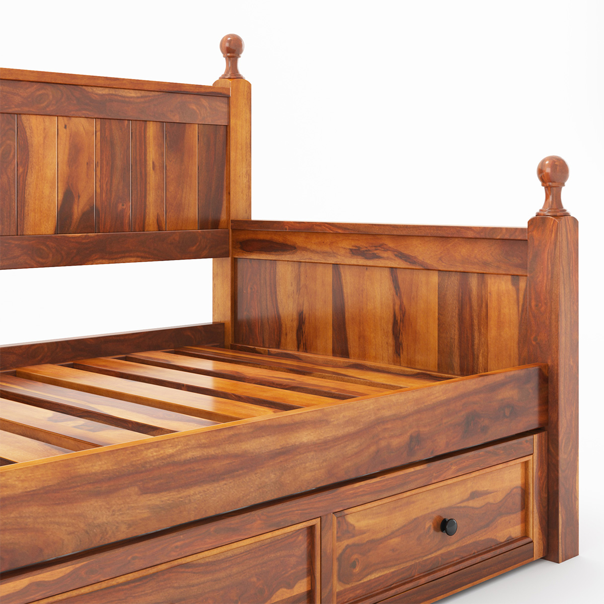 • The trundle glides out seamlessly with subtle iron knobs, while the entire frame rests on a solid base that guarantees strength, stability, and long-lasting performance.