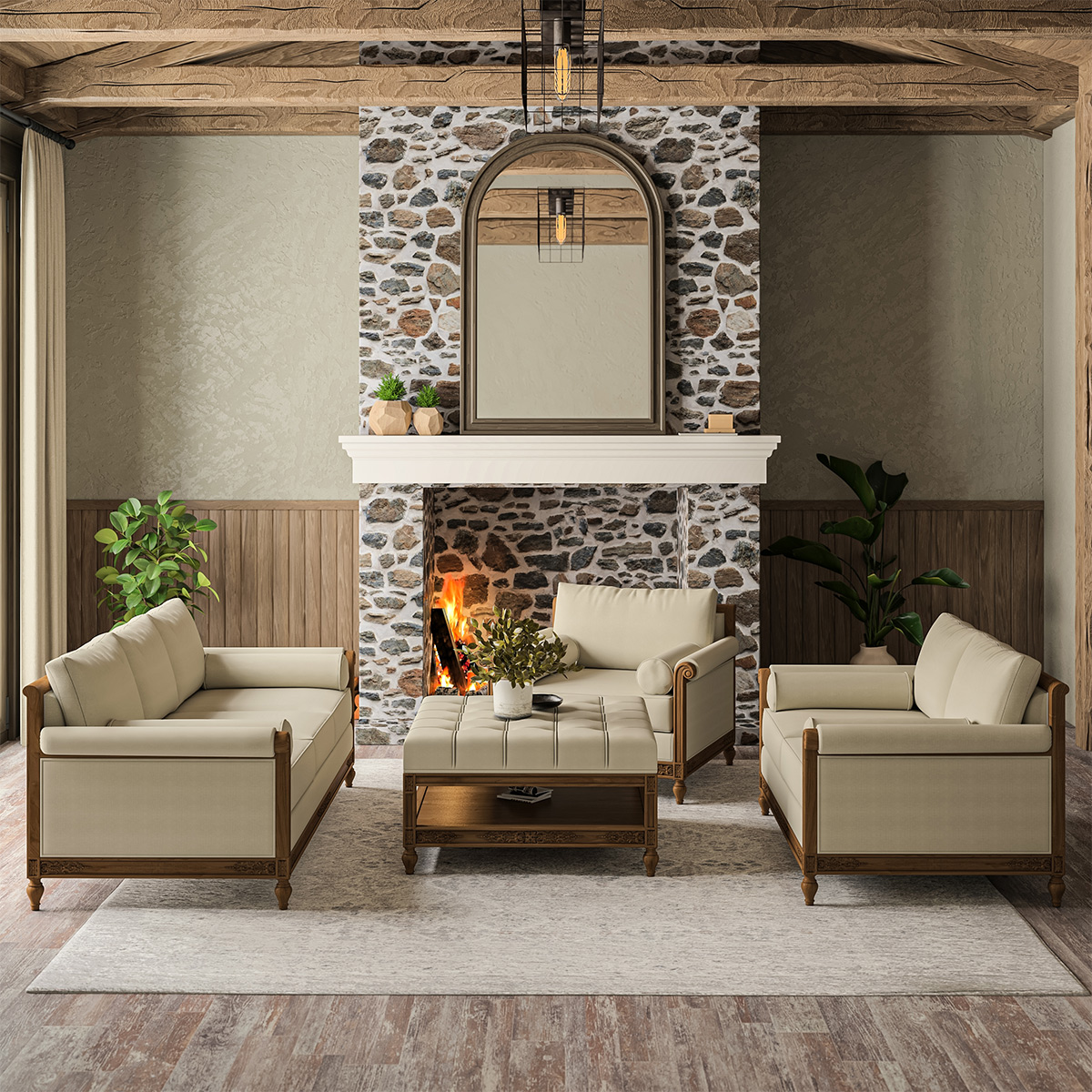 Settle into a space of timeless, graceful comfort with our Junction 3 Piece Living Room Sofa Set with Ottoman Table. Designed with the elegance of a classic European salon in mind, its elegantly exposed wood frame and plush upholstery create an open, sophisticated environment, ensuring a refined backdrop for all of life's moments.
