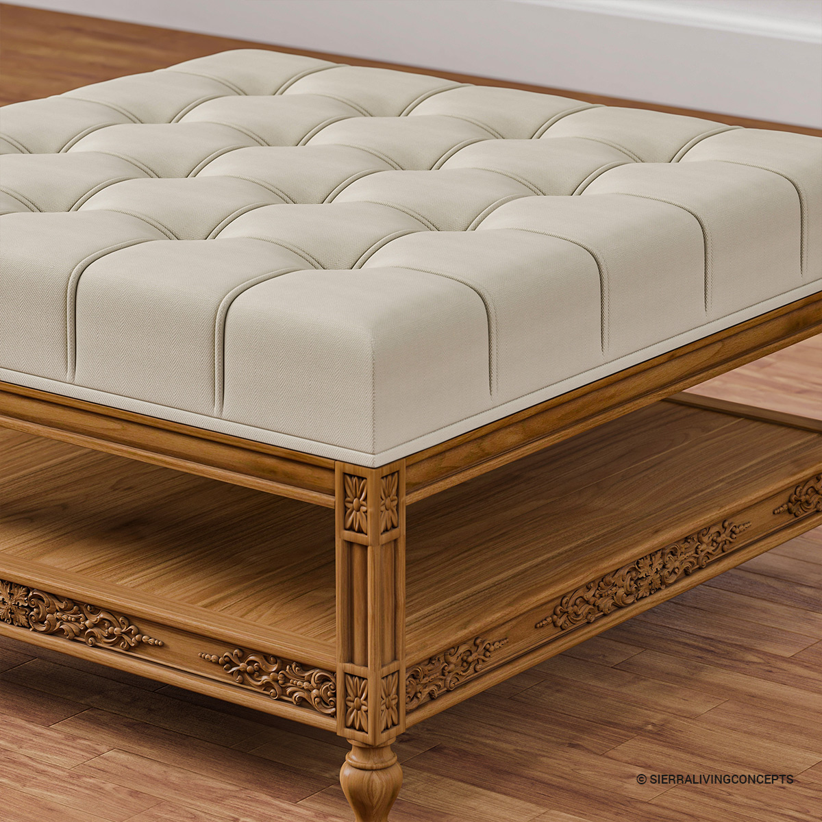• This 3-piece sofa set for a living room has an Ottoman which also serves as a coffee table with a tufted top for trays or feet, and a sturdy wood shelf below for books or decor.