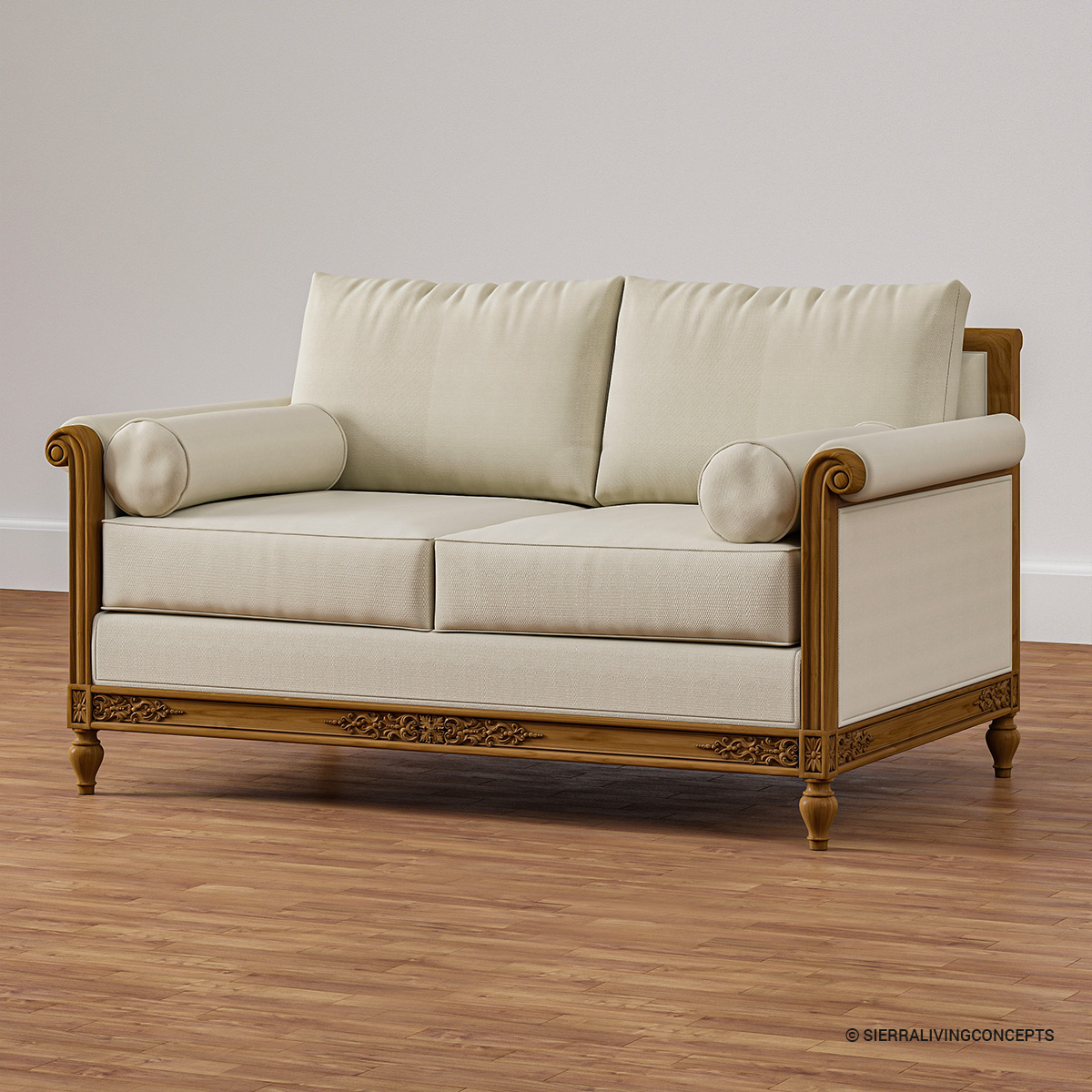 • A rich dark wood finish complements the light neutral fabric, and the gently scrolled, exposed wood arms create a pleasant, airy silhouette suitable for any living room sofa set.