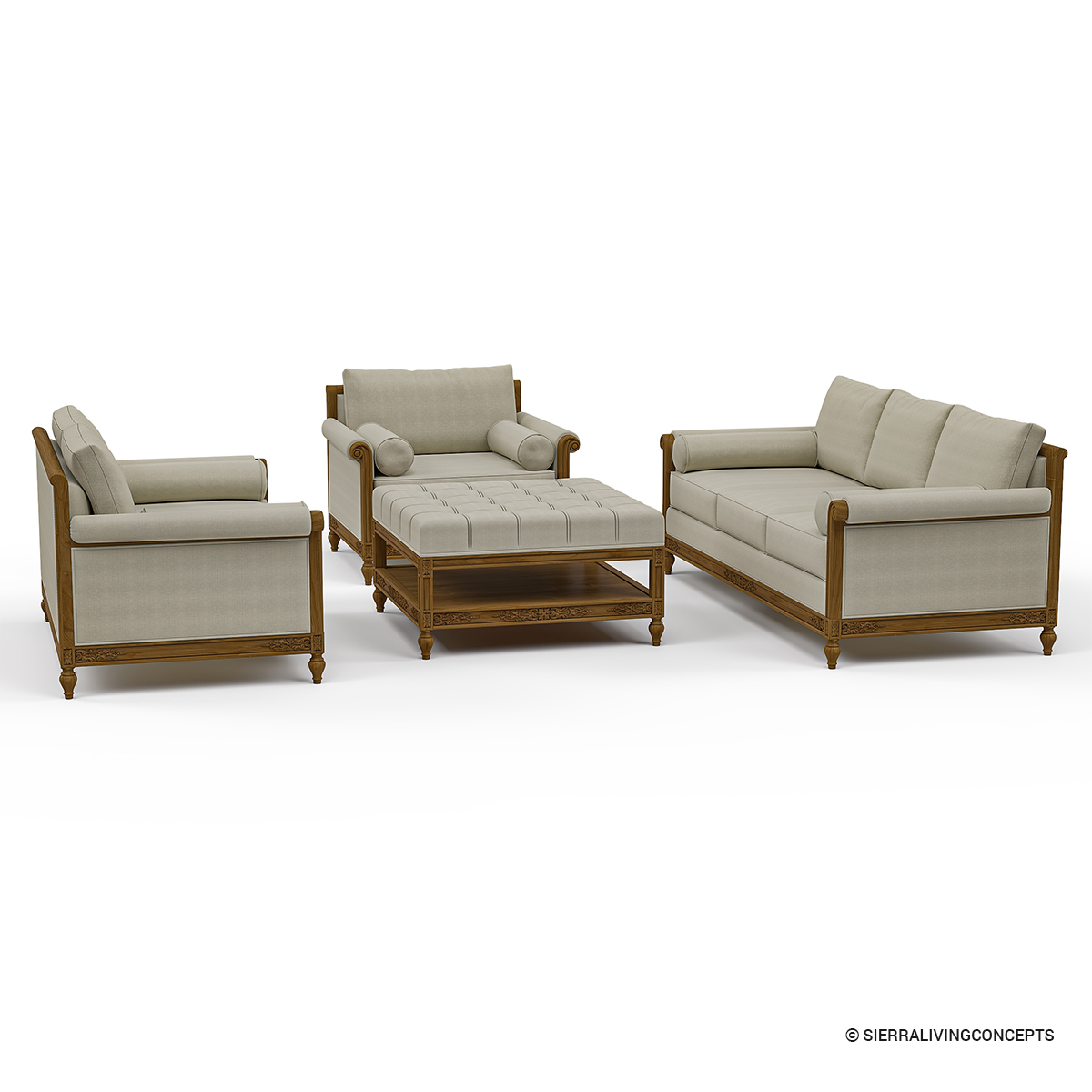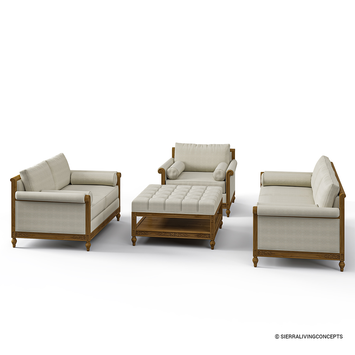 • This wooden sofa set includes a single-seater armchair, a 2-seater loveseat, a 3-seater sofa, and a matching ottoman coffee table, allowing you to build the perfect set for your room.