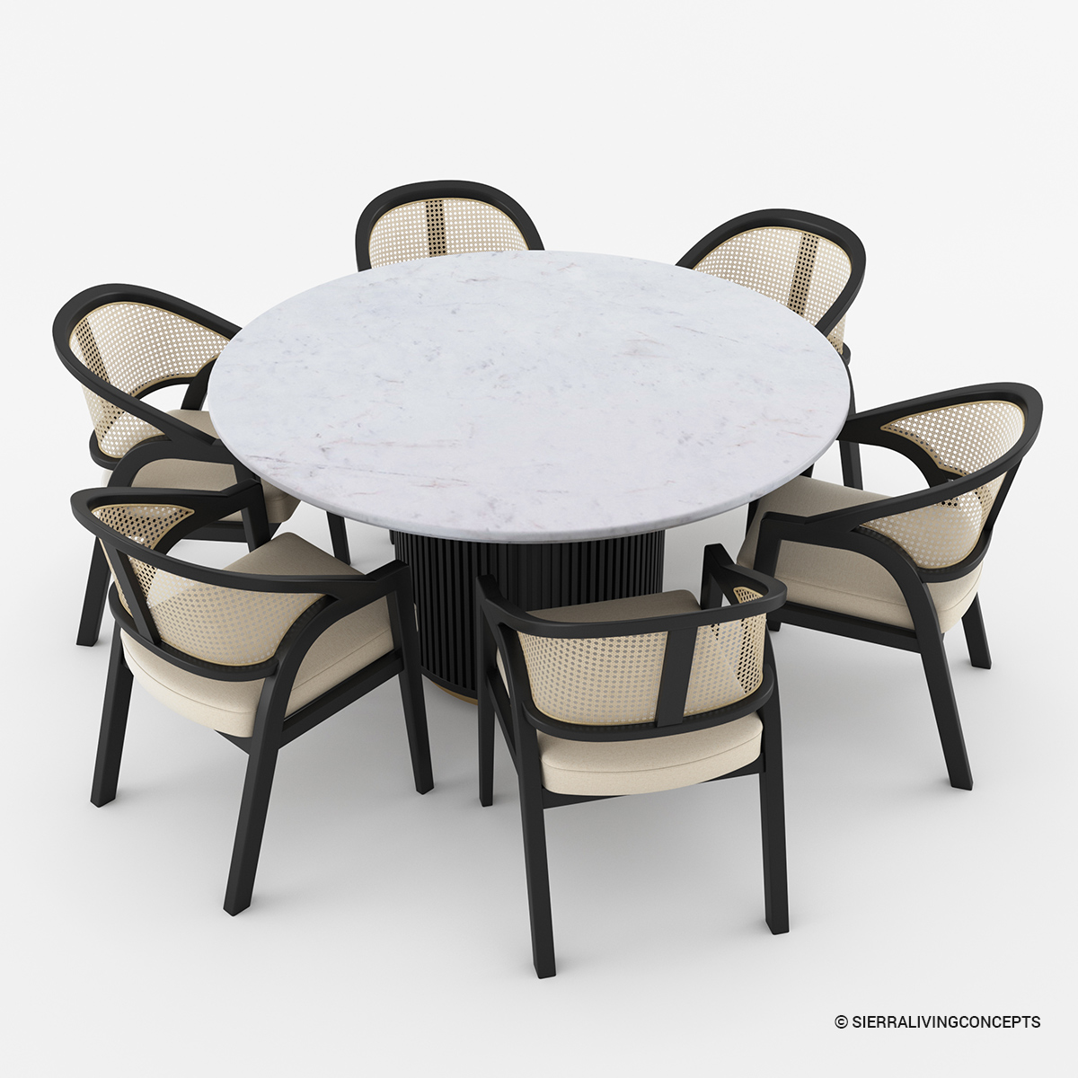 • Chic and contemporary, this black dining table set for 6 pairs a round marble-topped table with chairs featuring solid wood frames, natural cane backs, and soft, comfortable fabric upholstery.