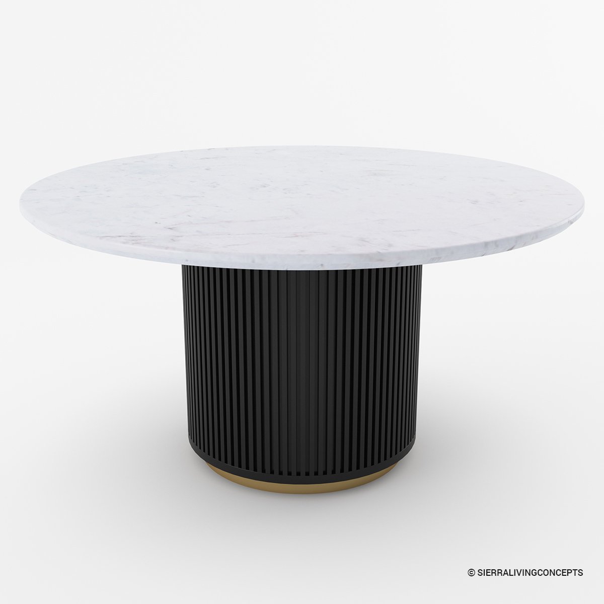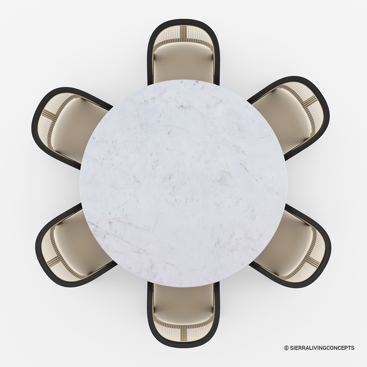 • The dining room table set for 6 highlights a polished white marble top against bold black wood frames, with gently curved chairs and a round table for an elegant, modern look.