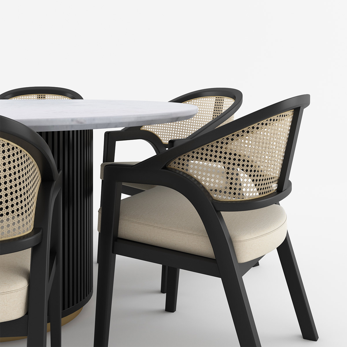 • The round marble table is large and sturdy enough to accommodate six people, with a pedestal base that allows for plenty of legroom, and the chairs have velvety upholstered seats and breathable cane backs for extended feasts.
