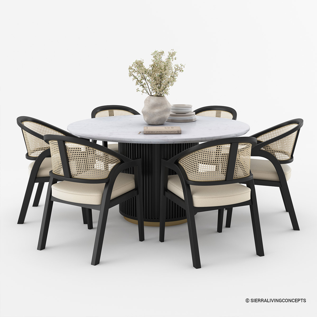 Our Slave Modern Black Round Dining Table Set For 6 brings style and comfort to every meal. This round dining room table set for 6 combines a bold black finish and fluted pedestal table with airy cane-backed chairs, creating a sophisticated centerpiece for memorable conversations and beautiful dinners.