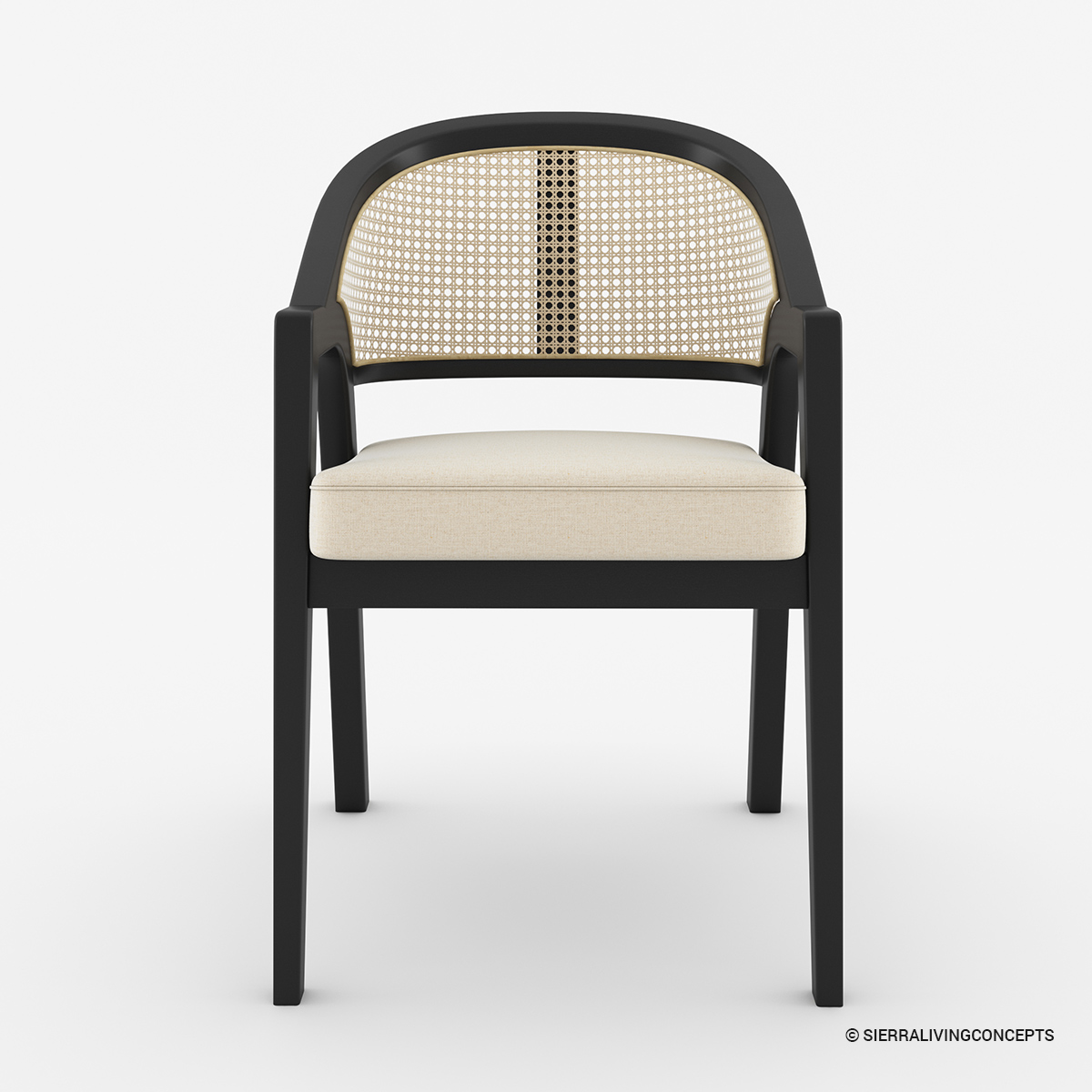• The black frame contrasts well with the light natural cane and cream color upholstered seat, and the dining arm chair's curving backrest gracefully glides into the armrests.