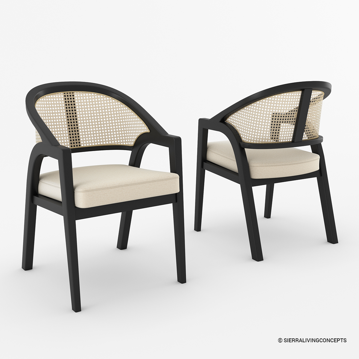 Pull up our Slave Modern Cane Back Black Dining Chair with Arms, a true design statement. This cane back dining chair is a beautiful study in contrast, blending a sleek black frame with the warm, airy texture of natural cane. It is designed to be as comfortable as it is chic, promising a sophisticated spot for every dinner guest.