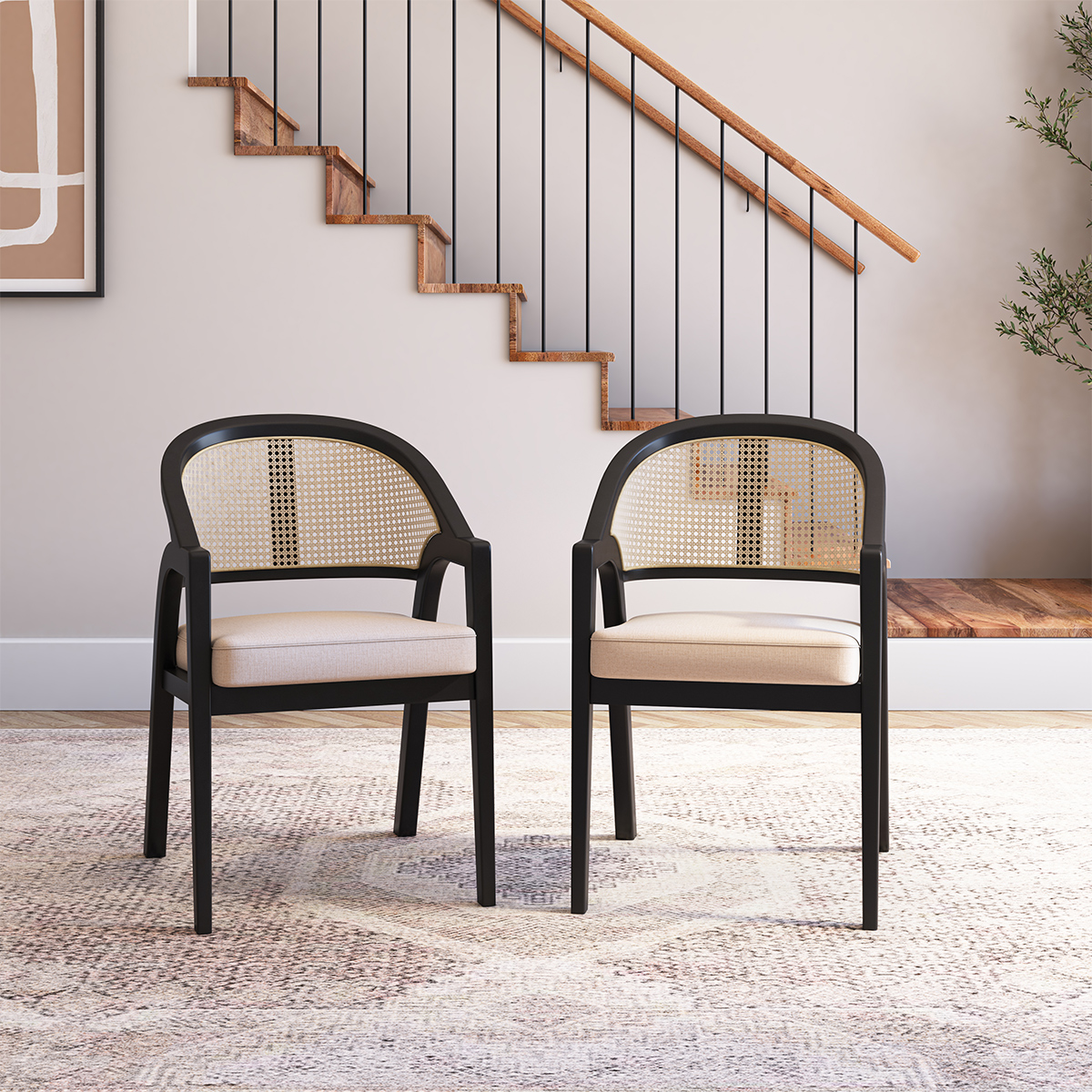 • Blending strong support with a sleek, modern black cane dining chair profile, this upholstered dining arm chair has four robust, tapering wood legs that provide a firm, wobble-free base.