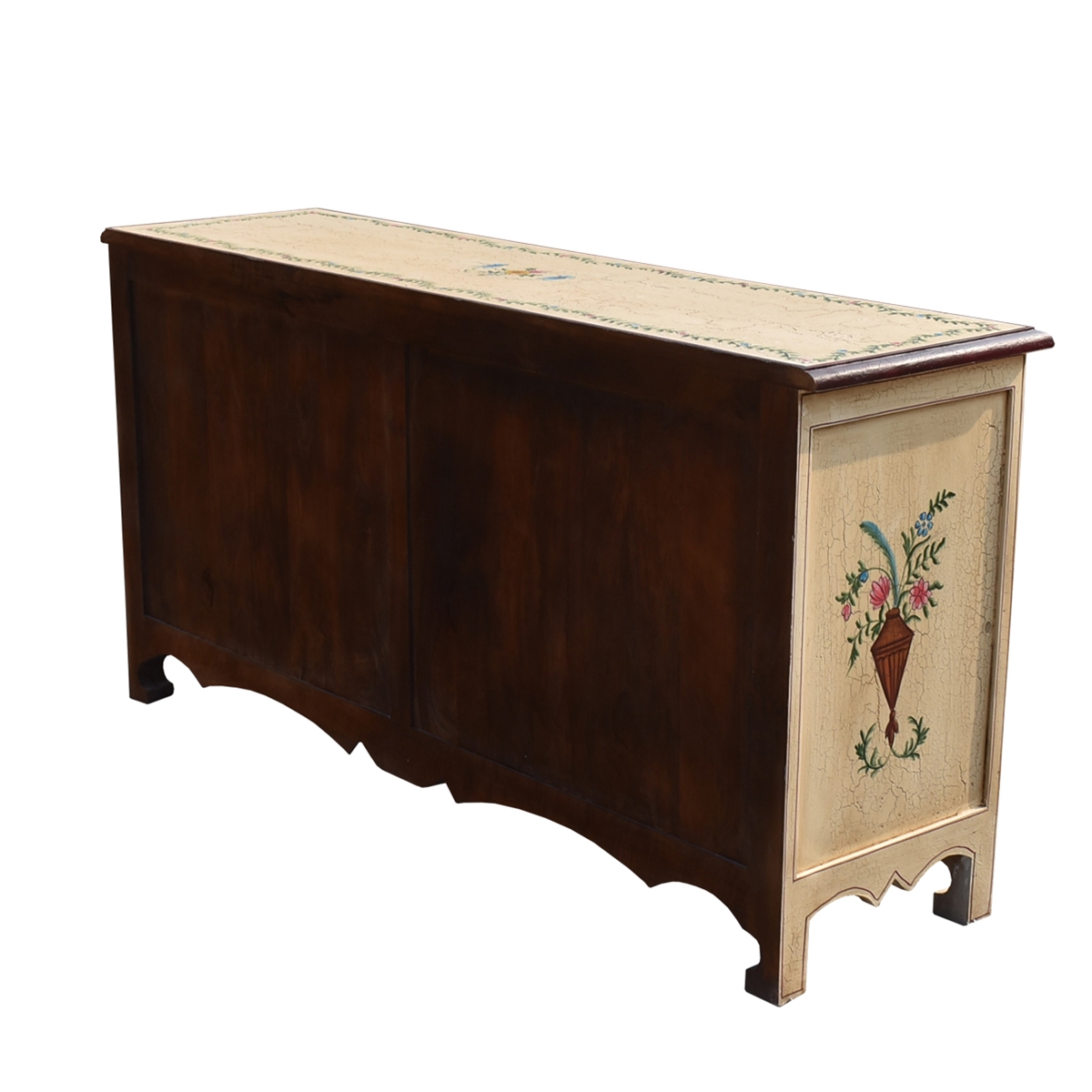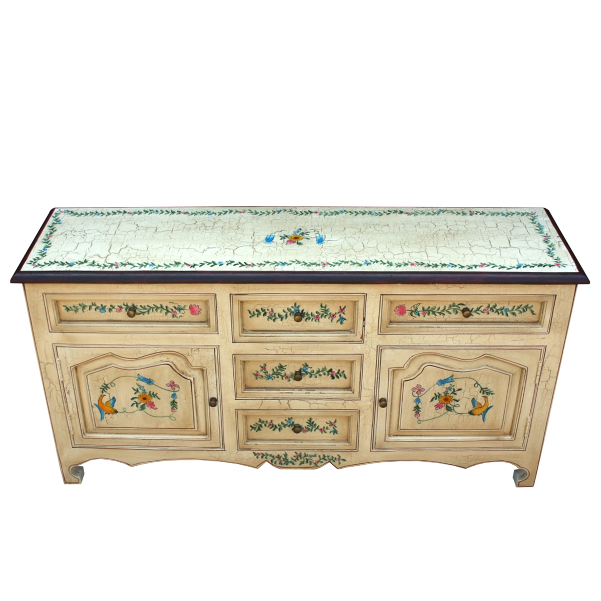 Delicate curves and lines define the Victorian style. Our Antique Victorian Hand Painted Solid Wood Sideboard with Drawer blends graceful design features with a delicate floral pattern. The large sideboard is handmade with tropical mango wood, an eco-smart hardwood grown as a sustainable crop. The cabinet is then aged with our distressing process that makes each piece a one-of-a-kind. You'll have ample storage space with two large cabinets and five drawers. The buffet stands off the floor and features a scalloped bottom.