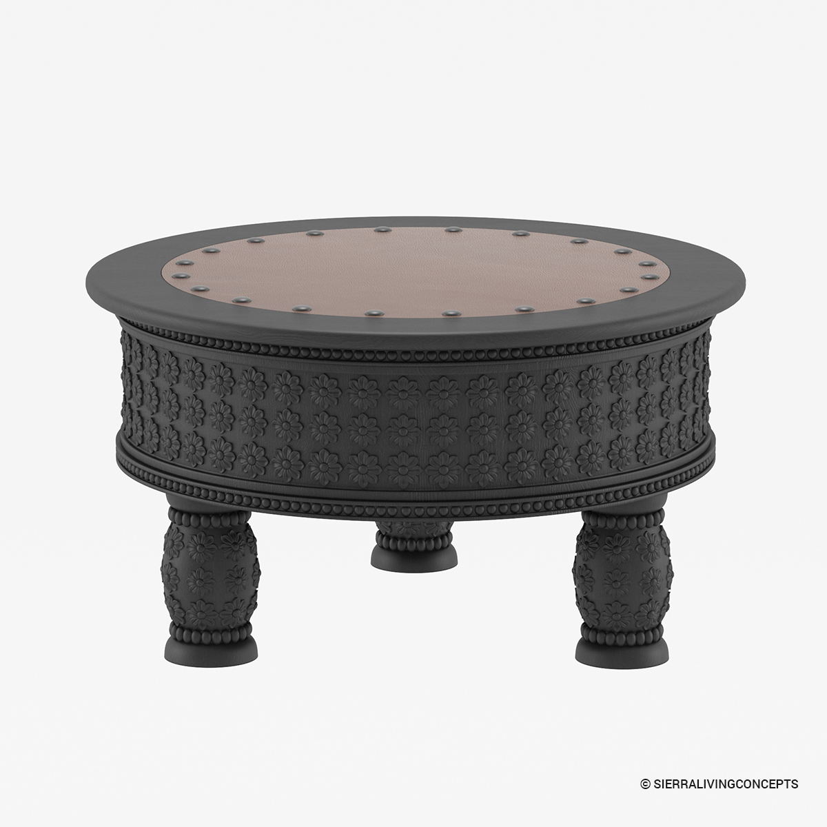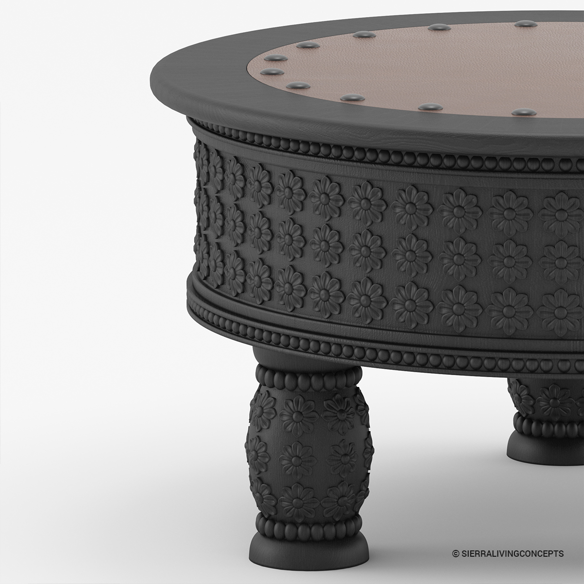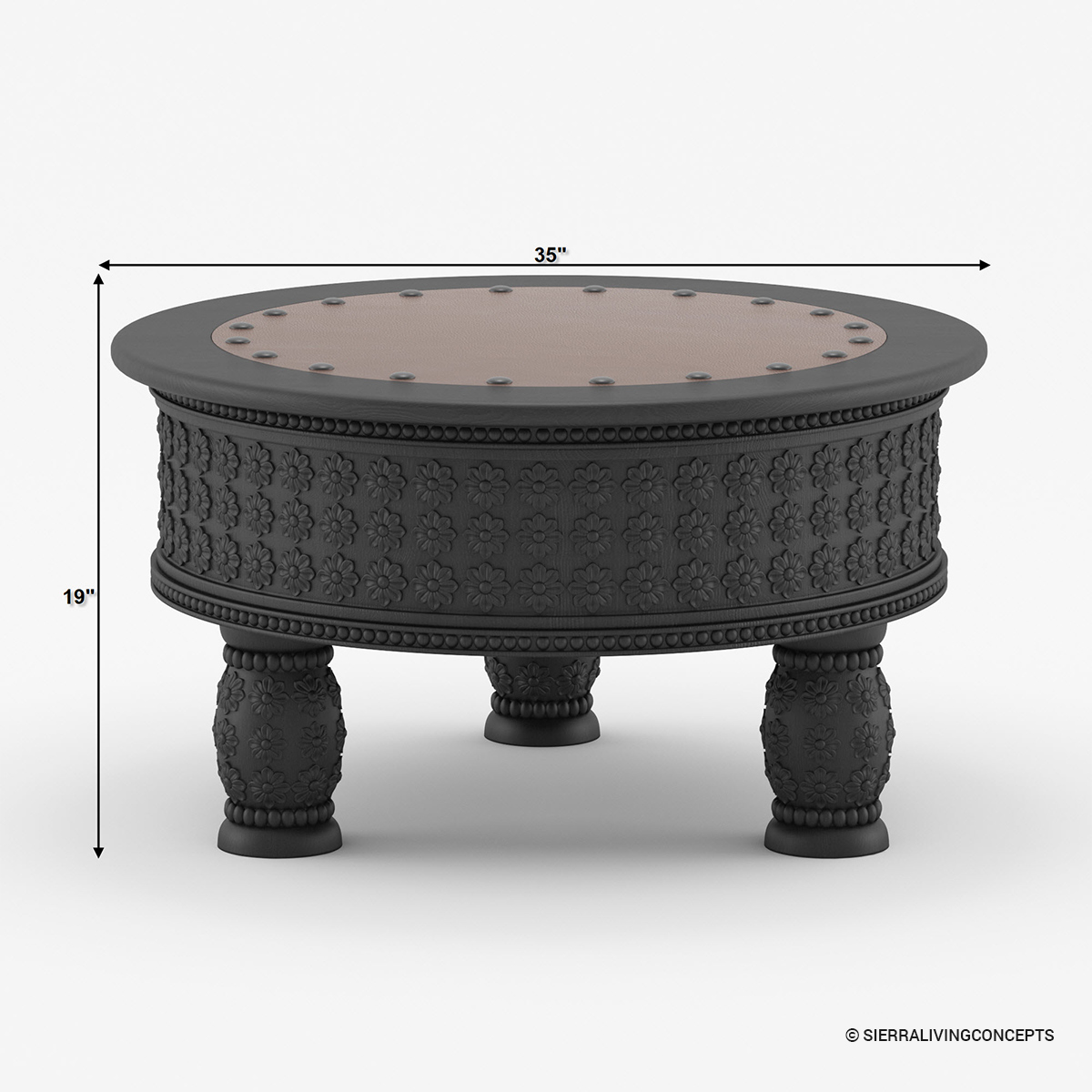 Bring finesse into your coffee breaks with our Nogales 3 Legged Solid Wood Black Round Coffee Table. Just imagine your favorite brew sitting on top of this round leather top coffee table, exquisitely carved in floral motifs and ornamented with well-styled ironwork. Rich in finish and fitted with elephant legs, every sip at this table brings a feel of luxury and style.