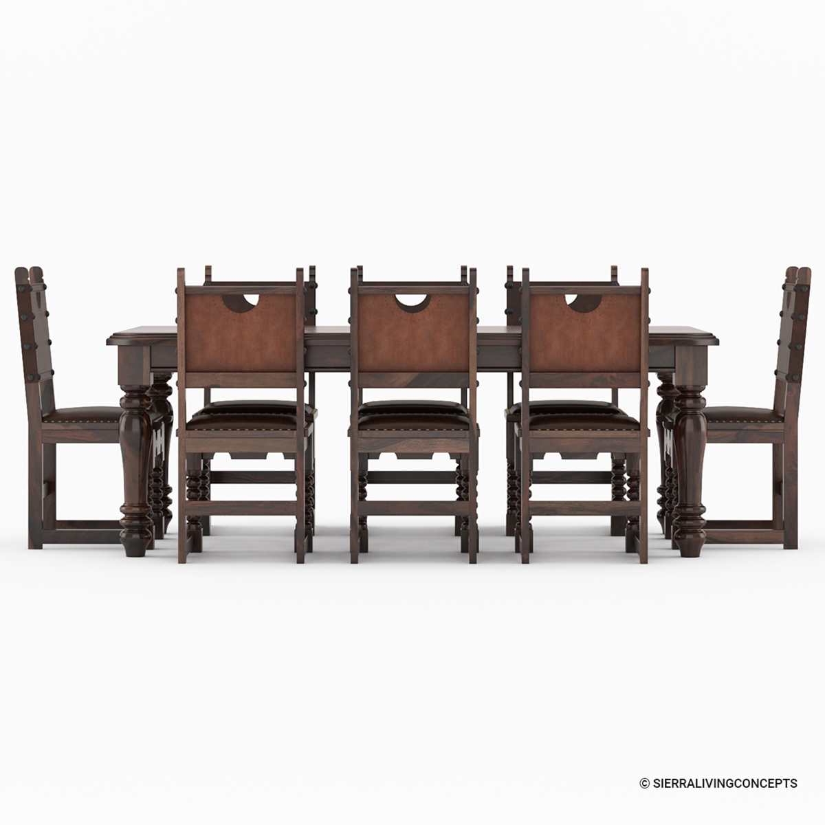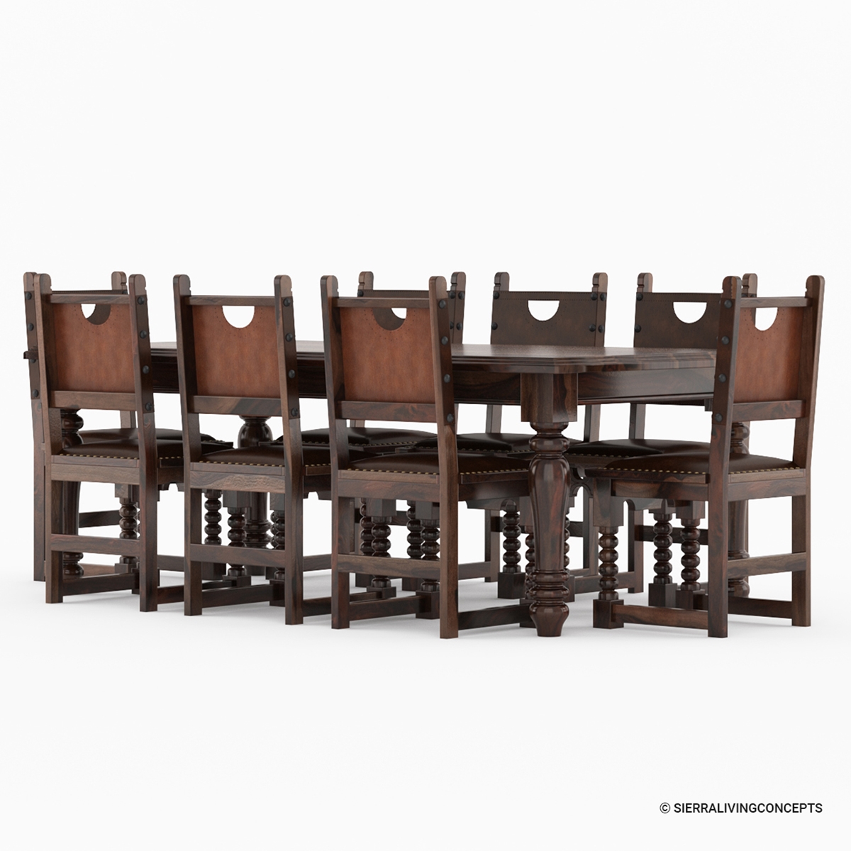 Ergonomically designed, this dining collection comprises a dining table with 8 leather seat chairs that match each other in style and form. The dining table features a rectangular table top with a ridged edge and it slightly hangs over from its frame. The stunning hand-applied finish add richness to its texture, while the stunning details make it a distinguished addition to your dining space. The table is supported by country column legs that lend a traditional touch to its aura.