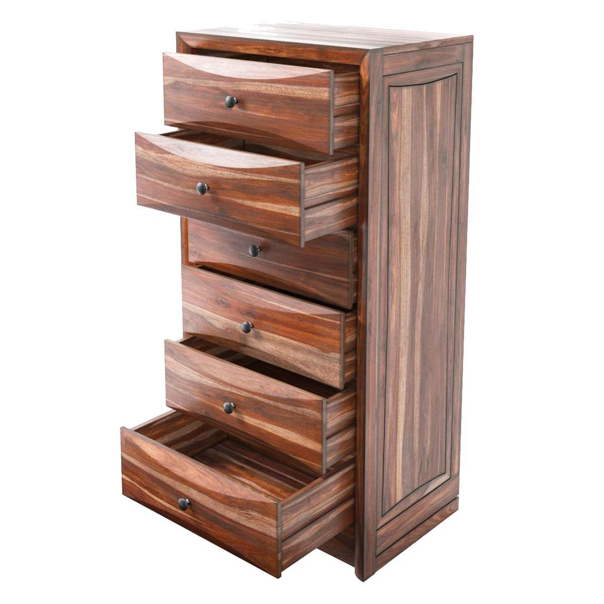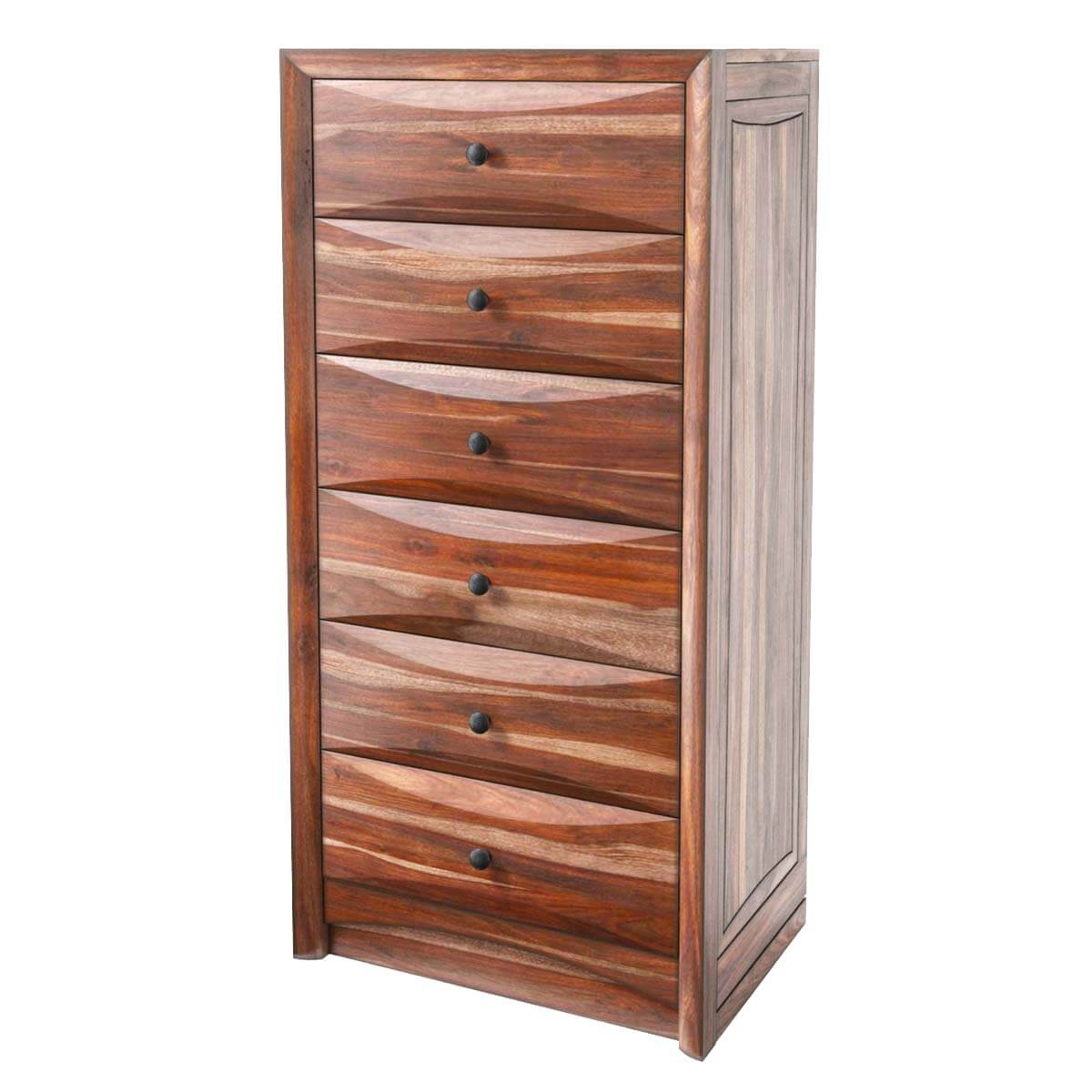 We combined rustic style with contemporary trends and created the Modern Pioneer Rustic Solid Wood 6 Drawer Bedroom Tall Dresser Chest. This design maximizes your storage and celebrates the natural beauty of fine hardwood. Each drawer has a rounded edge on the top and bottom which adds a visual softness to the dresser.