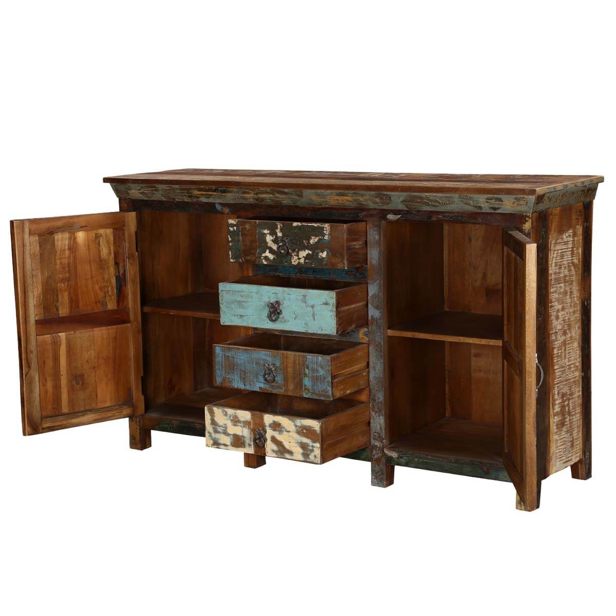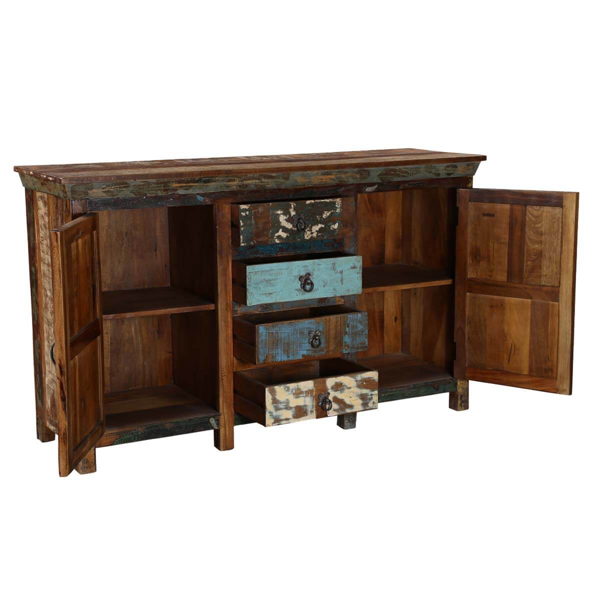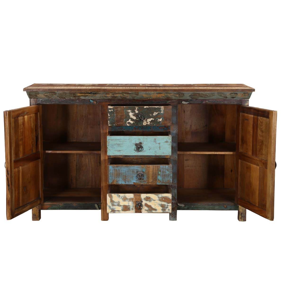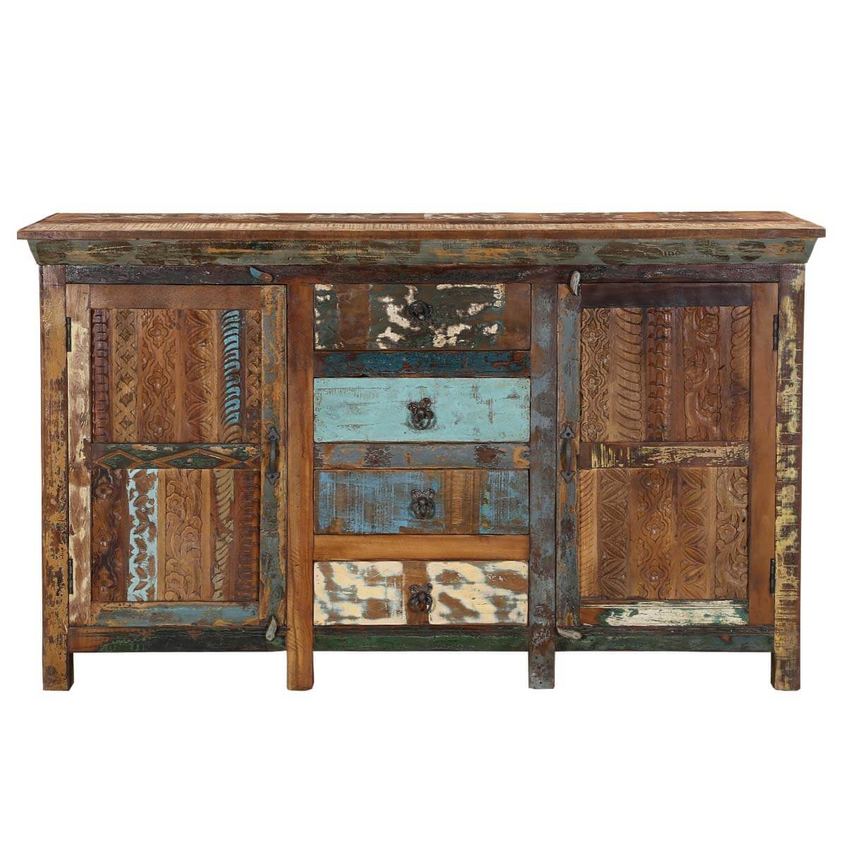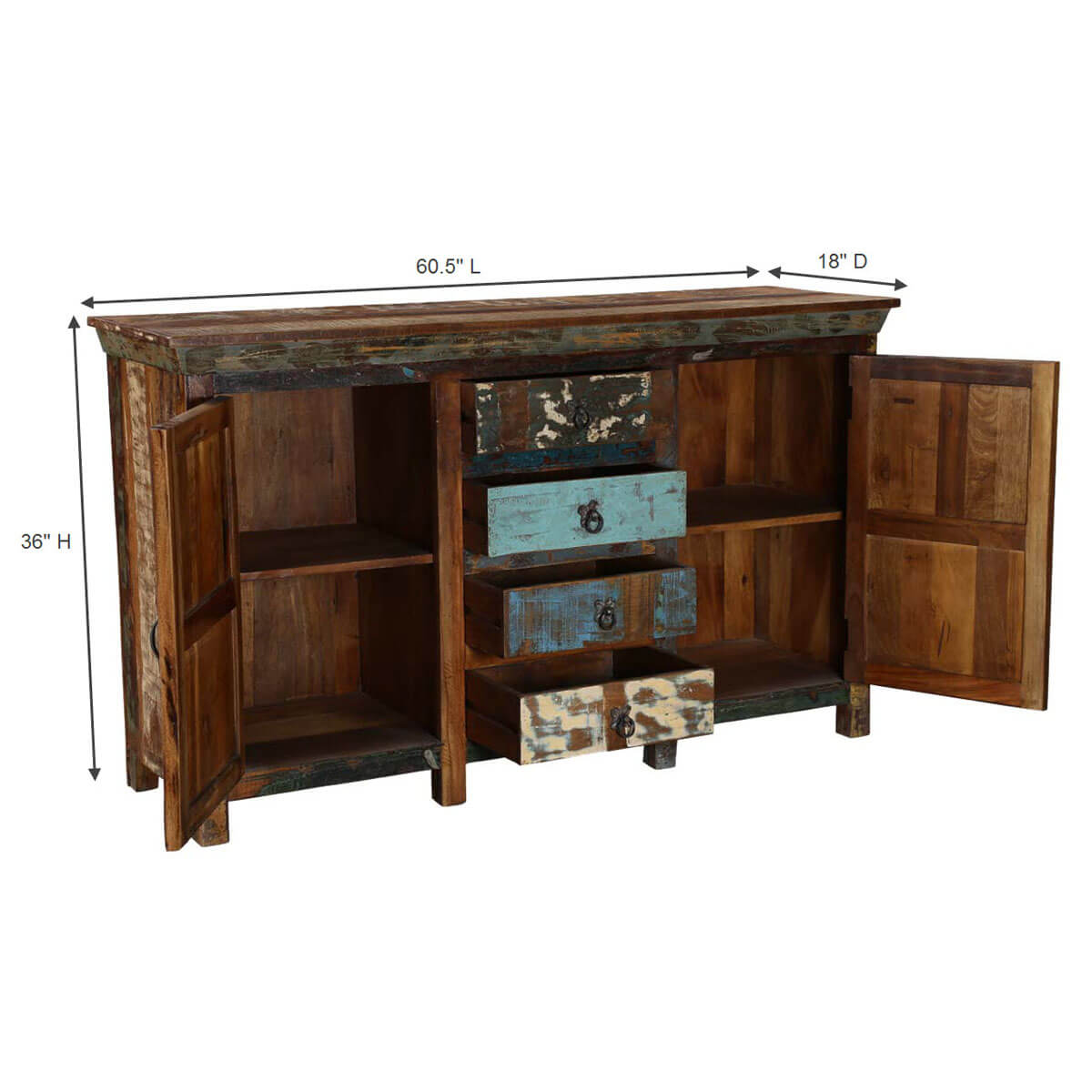 The large buffet server is 100% handcrafted from reclaimed solid wood pieces of different hues, giving it grace and looks that will captivate everyone’s attention. It comes with two doors with two shelves each to store glassware and larger accessories. The cabinet doors of this solid wood sideboard are embellished with stripes of intricate carving patterns. The four drawers in the middle offer space to store table linens, serve ware, and smaller accessories. The drawers come with ornate hand-forged metal ring pulls, adding to the traditional look of this rustic reclaimed wood sideboard. Two middle legs in the front ensure more strength. Place it in your dining space for easy access to the dining accessories while enhancing the room decor.