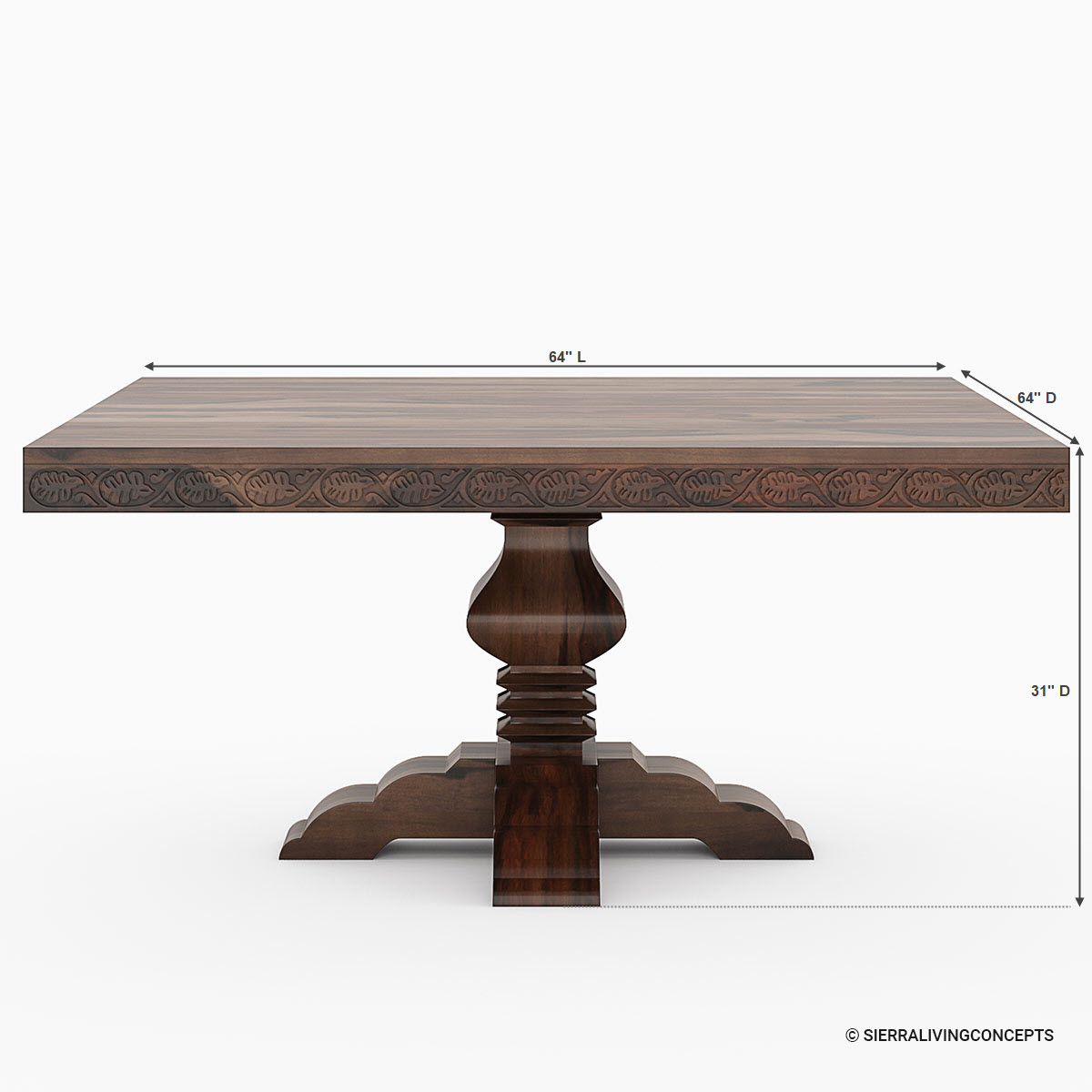 The Florida Handcrafted Traditional Rosewood Square Dining Table Set will enhance your dining room space with its traditional and graceful looks. The square dining room set for 8 people comes with a square dining table with beautifully hand carved apron and solid single pedestal base. The chairs feature iron grille with diamond patterns in the center, stylishly complimenting the hand wrought iron accents on the seat corners.