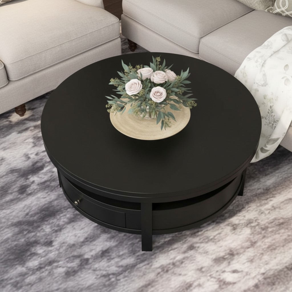 • Crafted in a modern, clean style, this black round coffee table combines solid, offering durable construction that makes it a stylish and functional centerpiece for any living room.