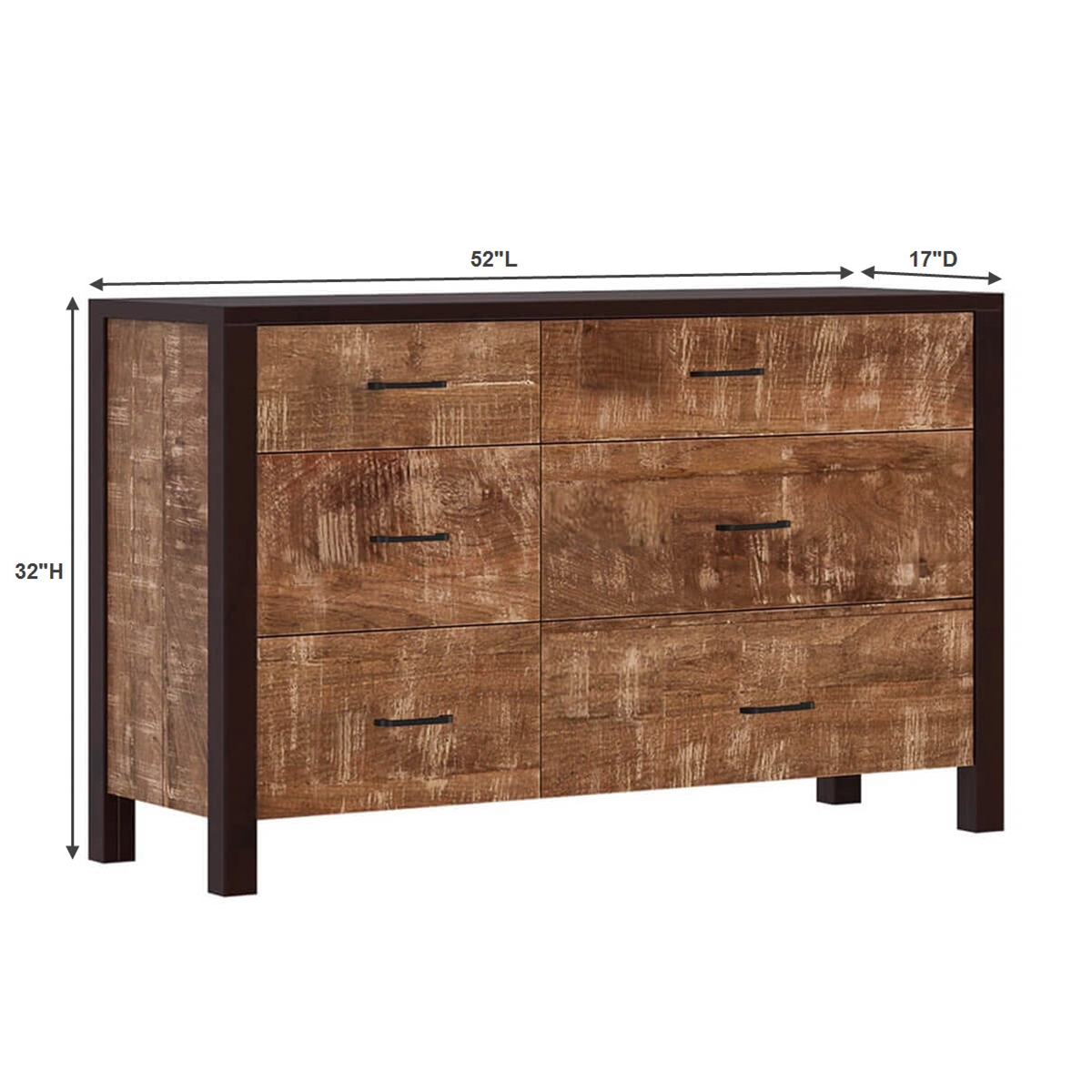 Clean lines and a substantial build are masterfully created in this rustic dresser. This is due to its solid mango wood construction, handmade by skilled artisans. The natural wood tones of the main body of the dresser are met with the striking contrast of a dark brown finish frame, of which superbly complements the simple metal hardware. The allure and tremendous volume of this stately two-tone dresser makes it an ideal solution for all of your storage needs. Match this farmhouse-synonymous style with other pieces in the collection including the 3 Drawer Nightstand and Platform Bed.